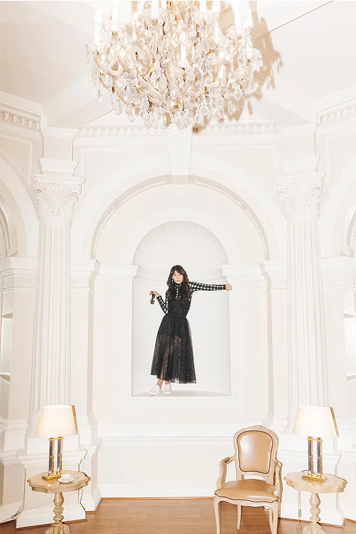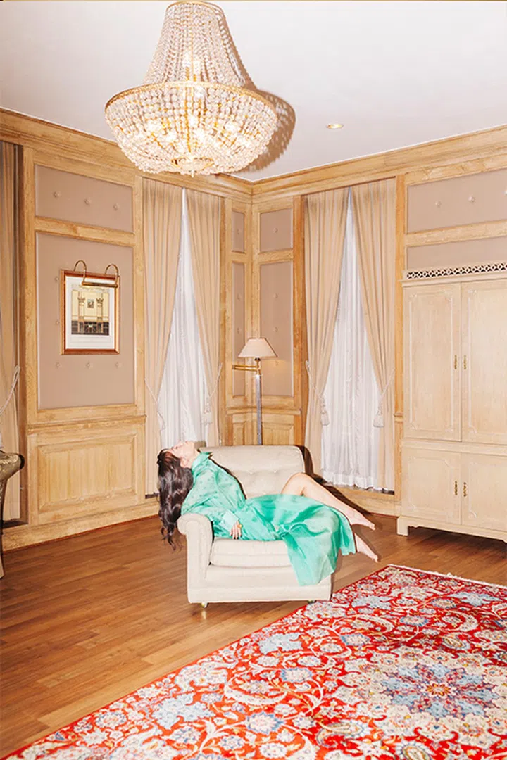 At the photographer’s suggestion, she gamely climbs into an elevated alcove, dives into a duvet, and poses on the carpet of her family’s hotel, which we’ve chosen to shoot in. Instead of coming across as preening, her comportment hints at a playful, laid-back nature and a professionalism that’s been cultivated since she was very young. “If only I could have been shot in silhouette,” she deadpans in jest, post-shoot.