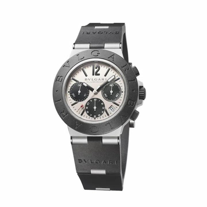 Bvglari Aluminium Chronograph aluminium and rubber watch on rubber strap, $5,840, Bvlgari