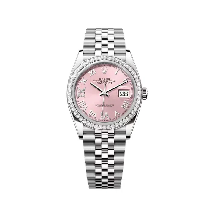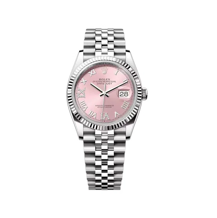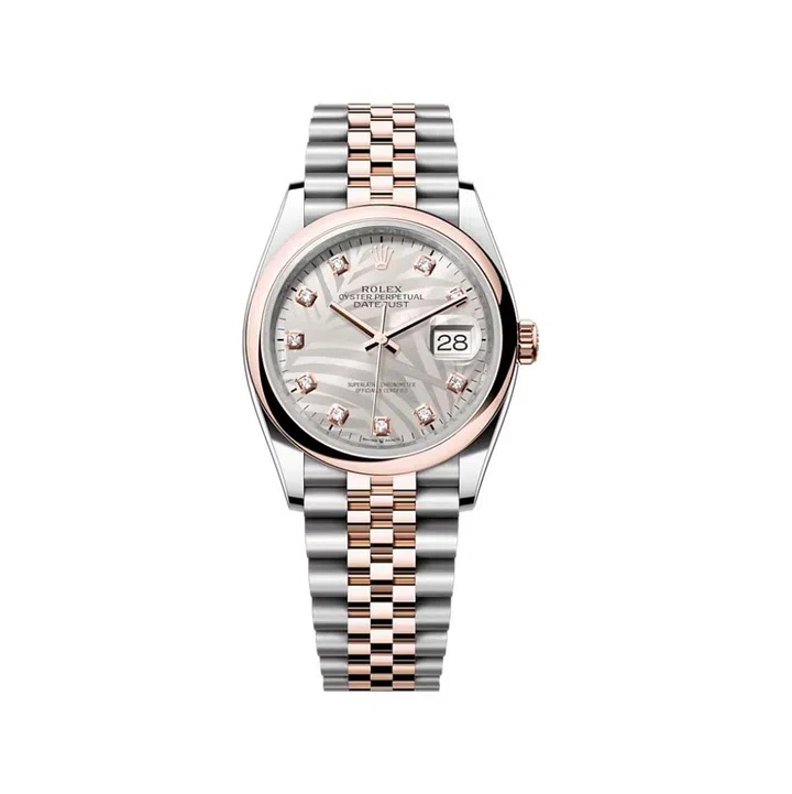 An Oyster Perpetual Datejust 36 in Everose Rolesor with a slate dial and Roman numerals.