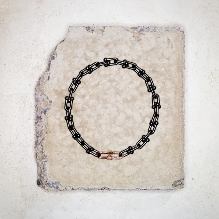 The black titanium necklace features a single gauge link in pink gold with paved diamonds.
