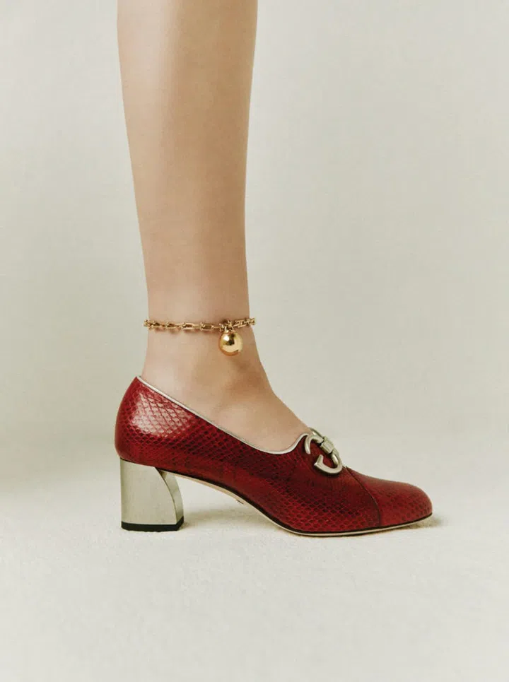 Tiffany Hardwear Wrap 18K yellow gold bracelet (worn as anklet), Tiffany & Co. Embossed leather loafers, Gucci.