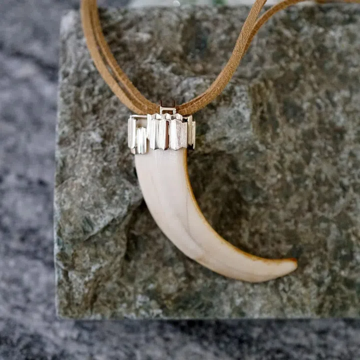 This eclectic-looking necklace is a bespoke pendant made from a wild boar tooth.