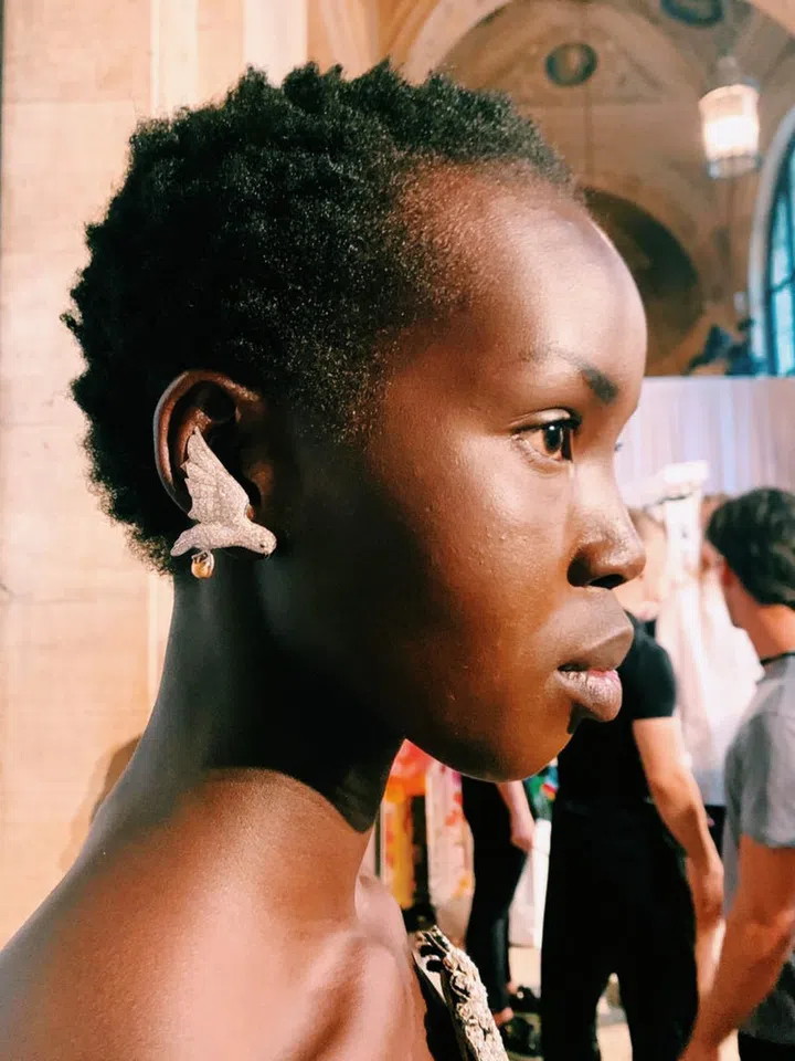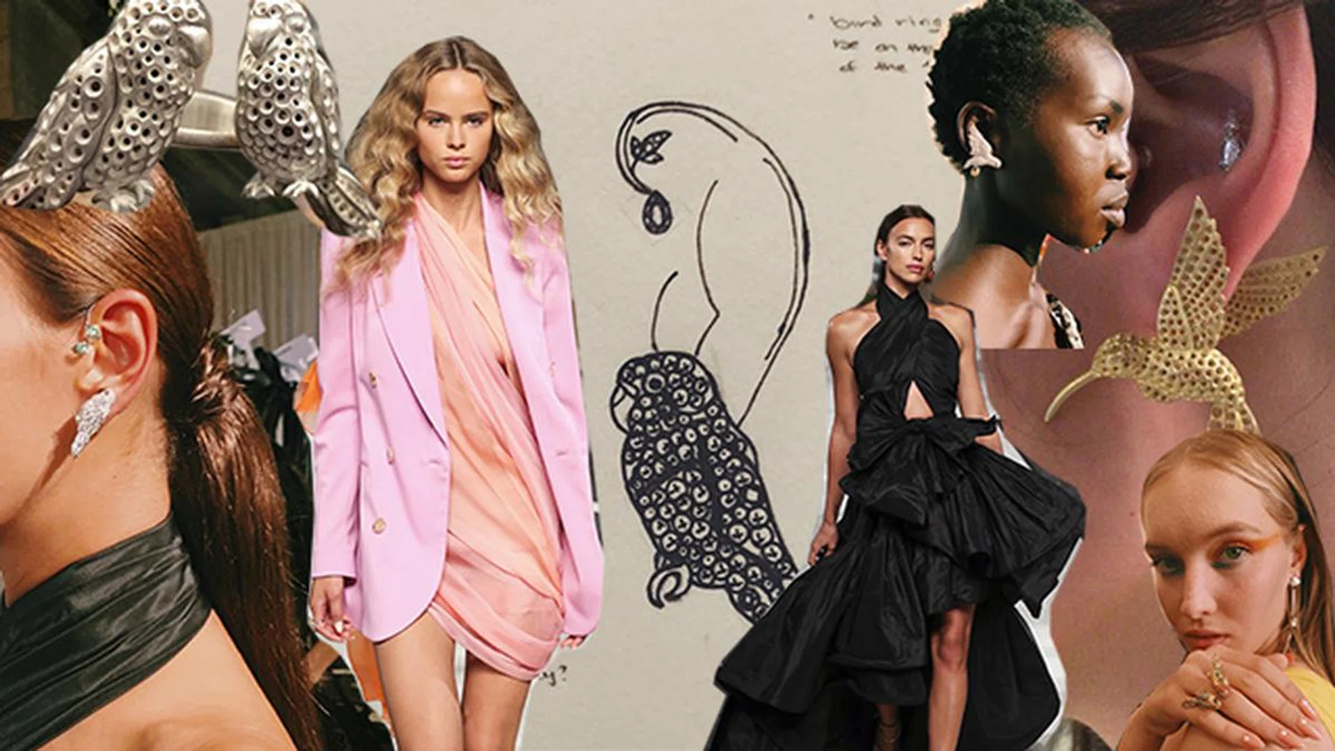 Danish model Olivia Vinten who opened the show in a degrade pink mini dress and flamingo pink blazer sported an open ring comprised of a lovebird perched on a yellow pearl. And for the finale, Irina Shayk smouldered in a flamenco-worthy taffeta evening gown and needed nothing else but a statement piece from Khoo: A diamond-studded ear cuff that featured a lovebird nesting. Voila.