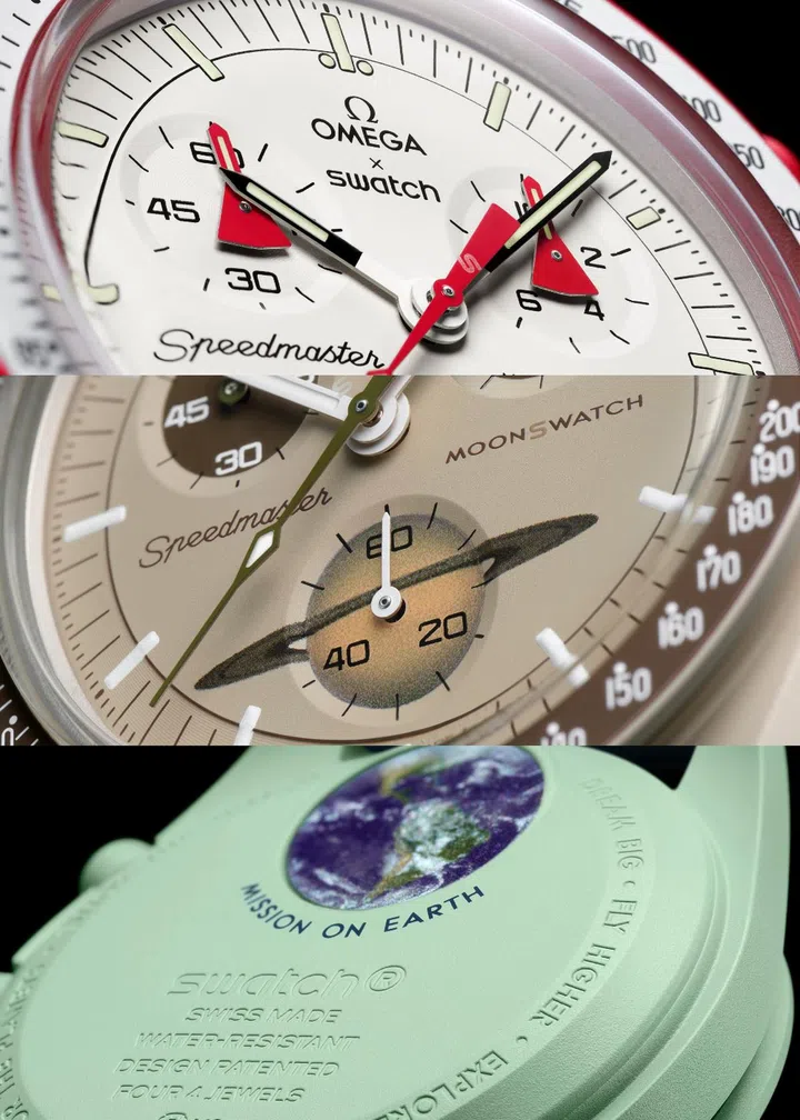 Measuring 42mm similar to the case diameter of actual Moonwatch models, each MoonSwatch ticker features a battery cover on the back decorated as the watch namesake planet, an inspirational mission statement on the case back, and a joint Omega x Swatch logos on the crown. The Velcro strap adds to the spacesuit theme of the outing.