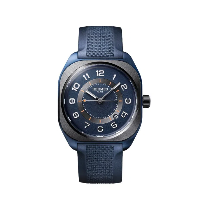 One of our favourite recent entrants on the luxury sports watch scene, the Hermes H08 was offered in cases made of titanium or a graphene composite when it was launched last April. This year, the French luxury house follows up with a self-winding timepiece in a 39mm dark blue, PVD-treated titanium case with a sunburst satin-brushed black ceramic bezel.