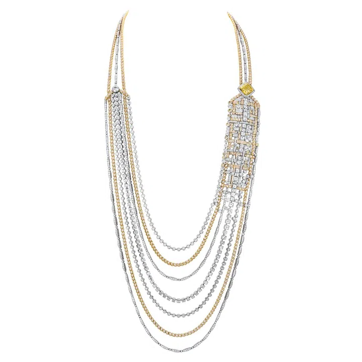 Meet the piece de resistance of the collection, an almost $2.7 million white, and yellow gold sautoir necklace. Strands of gold and round- and square-cut diamonds converge into a tweed-like weave on the left side of the necklace and topped off with a 7.10-carat cushion-cut yellow diamond. Chanel also pays homage to the Mademoiselle's love for seafaring by making the gold strands in the style of nautical ropes.