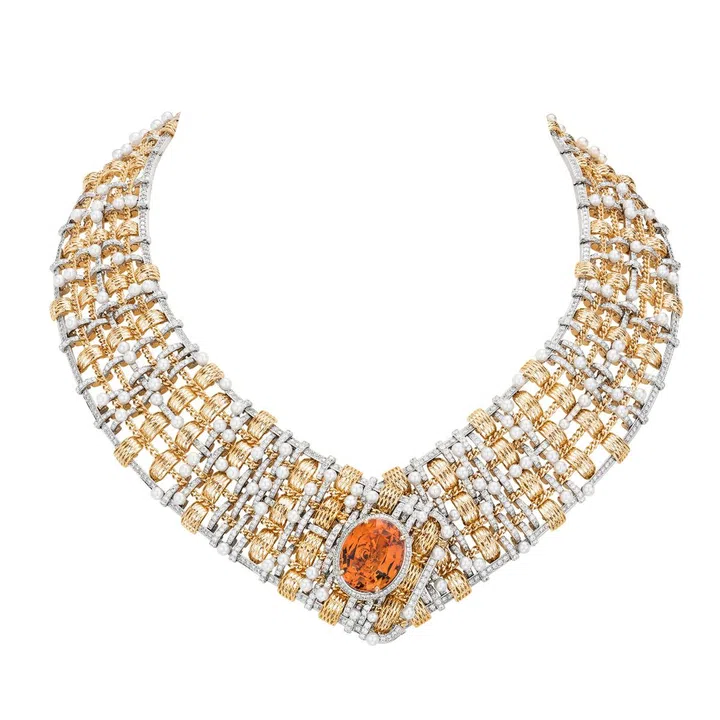 A literal interpretation of a collar necklace, this graphic design takes cues from the round neckline seen on tweed jackets. The rich textural quality of the necklace comes from the interlacing of perforated yellow gold with diamond-studded platinum. To give the piece more sparkle, cultured pearls dot the piece, while a 20.40-carat imperial topaz serves as the "button" of the collar necklace.