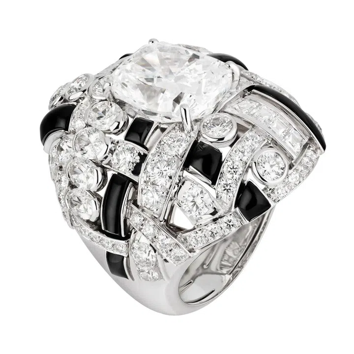 Priced at more than $1.8 million, this white gold piece is the priciest ring in the entire collection. The bold architectural design is an ode to two well-loved house codes: monochromatic colours and tweed. Set with black onyx and diamonds, the ring is topped off with a whopper 6.07-carat cushion-cut diamond.