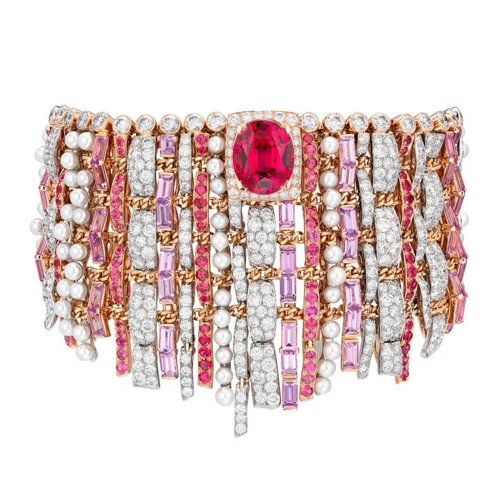 This platinum bracelet will remind you of having fringed tweed on your wrist while its articulated design means the fringes sway beautifully when worn. Peek closely and you will notice 'yarns' made of baguette-cut sapphires, pearls, and spinels woven with wefts of pink gold chains (a nod to the metal chain that is sewn into the hem of Chanel tweed jackets to give the garment its structure). The crowning glory of the piece is a 6.72-carat oval cut spinel.