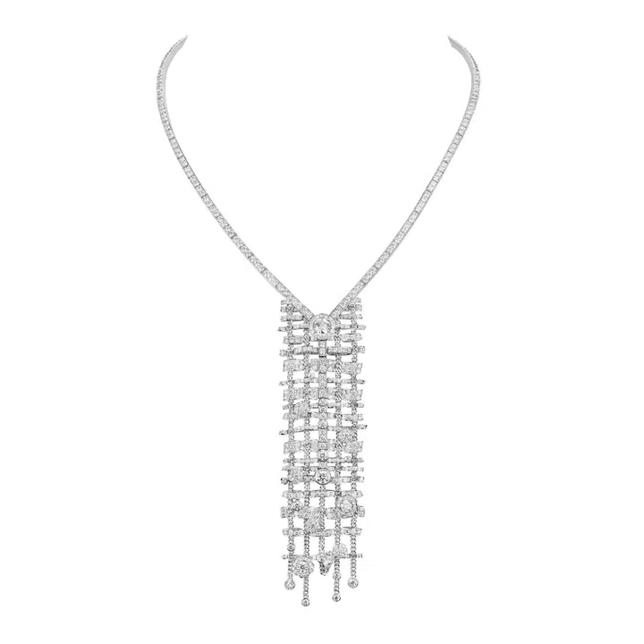 This piece features an abstract interpretation of tweed fabric on the pendant. Irregular-shaped "yarns" of diamond-studded white gold evoke the imperfectly raw beauty of a tweed weave that Gabrielle Chanel cherished. Meanwhile, dainty camellias are interspersed on the pendant as a homage to her favourite flower.