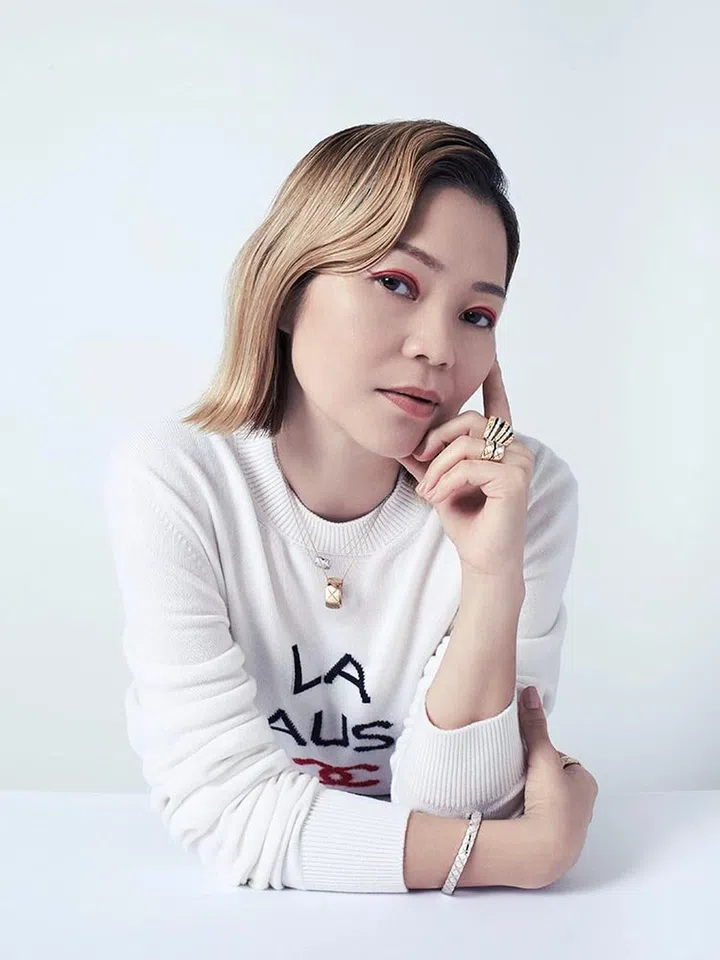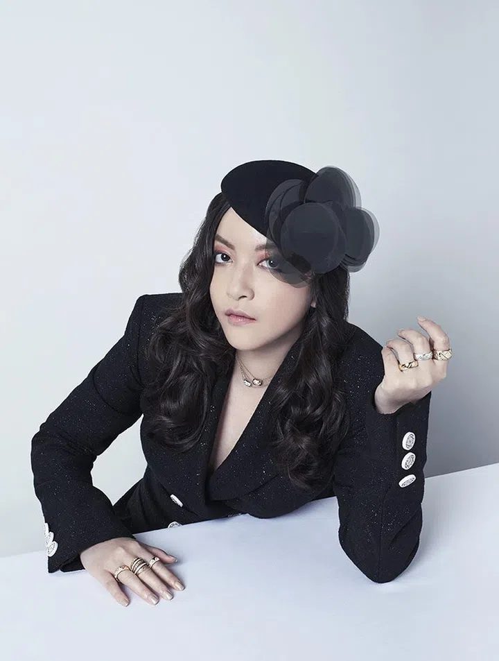 Angie Chen, who curates for luxury vintage and pre-loved fashion e-tailer The Fifth Collection, wears necklaces in 18K beige and white gold, (on fingers from far left) 18K yellow gold ring with diamonds, 18K yellow and white gold ring with diamonds, 18K beige gold ring, 18K yellow gold ring, 18K white gold ring, and 18K beige gold ring with diamonds, and wool jacket. Fascinator, Chen’s own