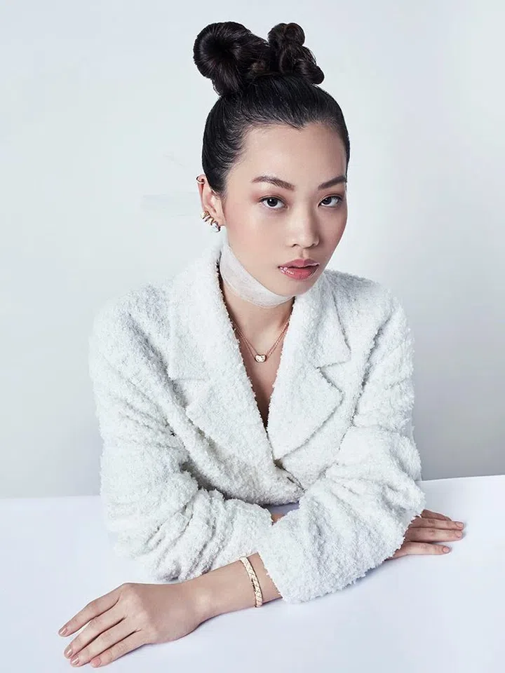 Pastry chef Natalie Eng, who specialises in artfully-designed French patisserie, wears (from top) 18K yellow and white gold ear cuffs with diamonds, 18K white gold ear hoops with diamonds, 18K beige gold necklace, matching bracelet, and tweed jacket. Tulle choker, stylist’s own