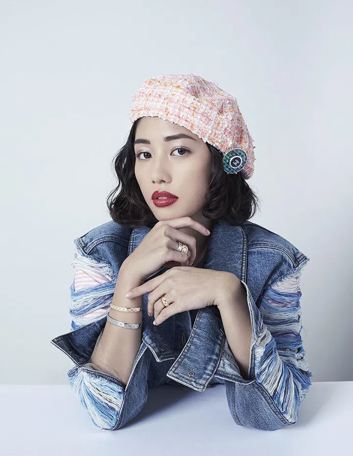 Student and familiar face on the local street style scene Clara Hong wears (on right hand) 18K white and yellow gold ring with diamonds, (on left hand) 18K beige gold ring, 18K white and beige gold bracelets, denim and tulle jacket, cotton T-shirt, tweed beret, and metal brooch
