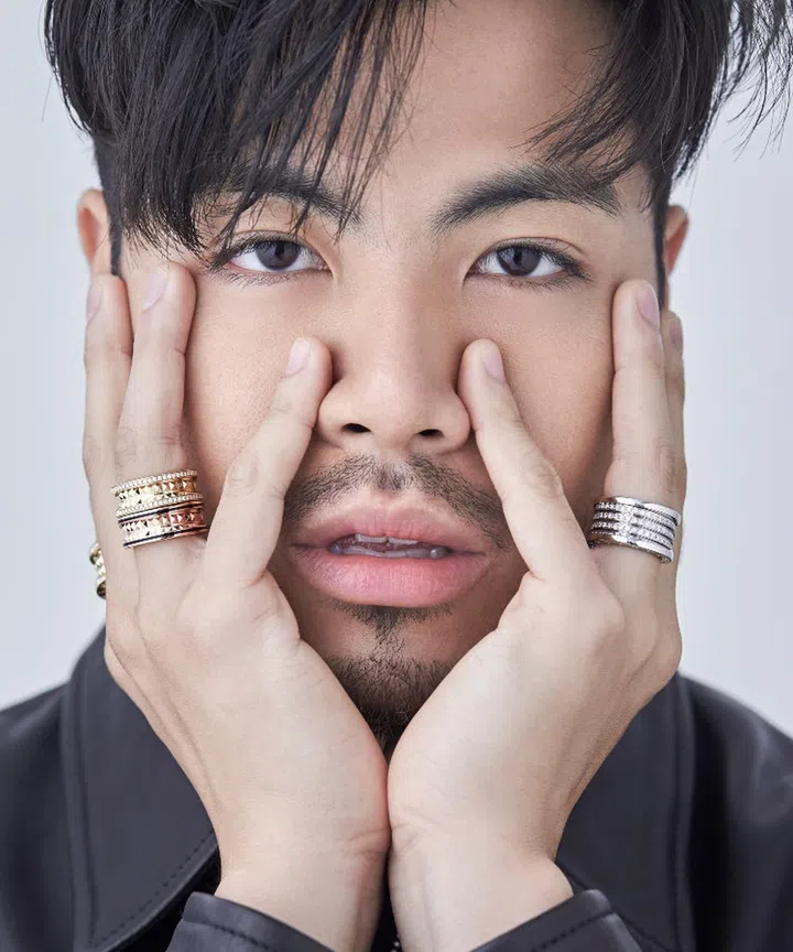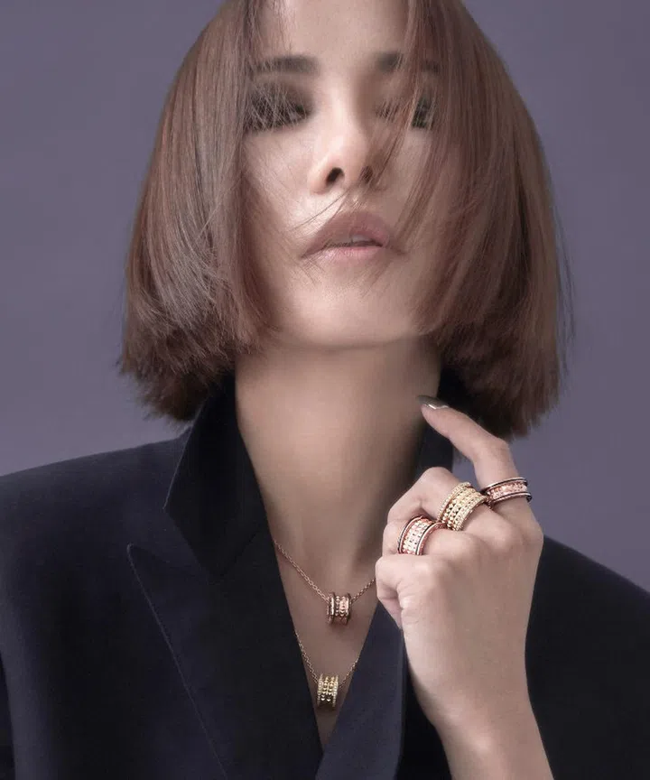 On neck: B.zero1 Rock 18K pink gold pendant with ceramic (top) and B.zero1 Rock 18K yellow gold pendant with diamonds, both worn on 18K pink and yellow gold chains respectively. On hand (from left): B.zero1 Rock 18K pink gold ring with ceramic, B.zero1 Rock 18K yellow gold ring with diamonds and B.zero1 Rock 18K pink gold ring with ceramic. Jacket, Xie’s own
