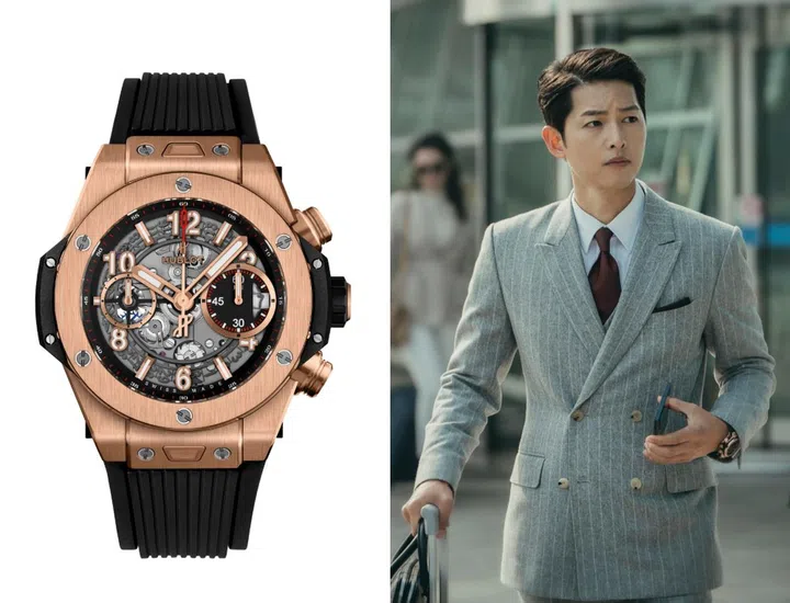 You may recognise this timepiece from the scene where Vincenzo was robbed of his watch. This flashy Hublot design comes with a hefty 45mm satin-finished and polished 18K King gold case. The watch is also a workhorse, boasting up to 72 hours of power reserve.