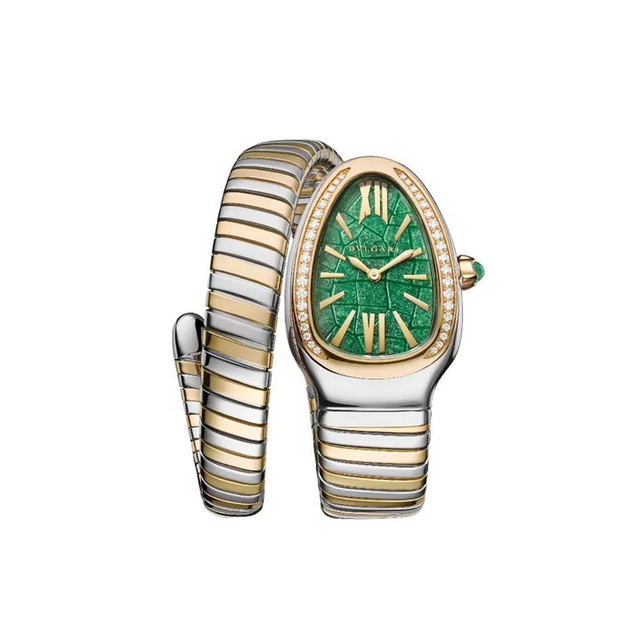 Bvlgari X Tadao Ando Serpenti Tubogas 18K yellow gold and steel watch with adventurine and diamonds on matching bracelet, $24,000