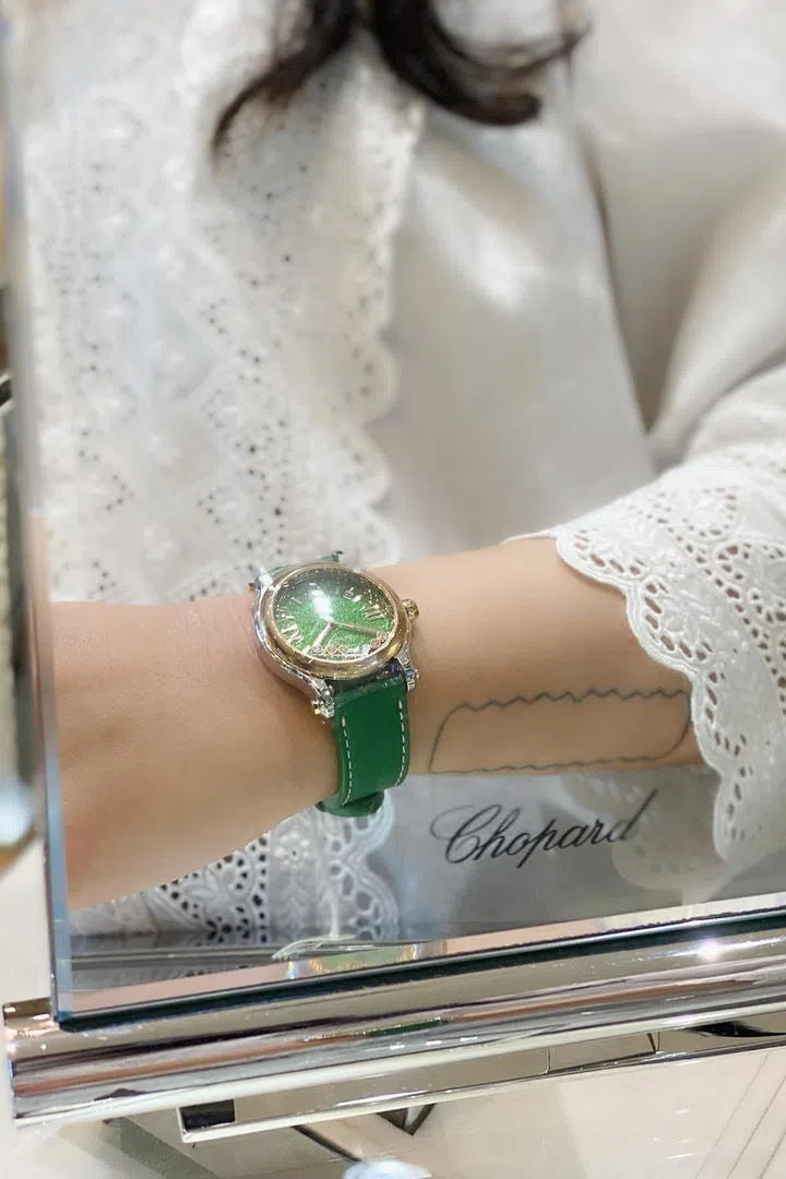 I tried on the Happy Golf model from the line, which as its name suggests, is an homage to the grassy, classy sport. The case measures a dainty 33mm, for wearers who prefer a more understated presence. The fun part of this watch? The diamonds dance and glide across the dial! I was instantly taken by this whimsical feature. On a day of back-to-back errands, I can easily see these moving gems being a moment of casual magic. Think of it as a personal pinball machine – a diamond-encrusted one, that is.